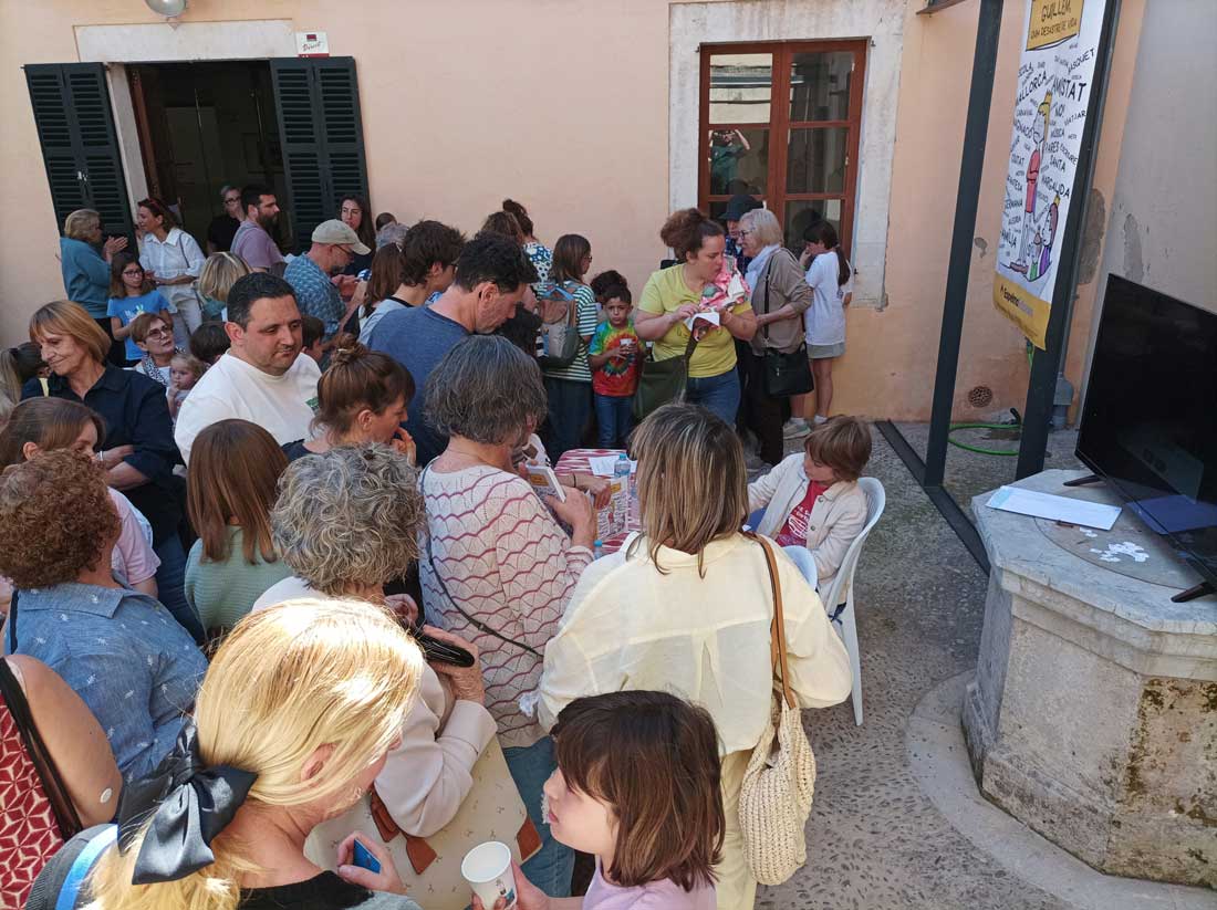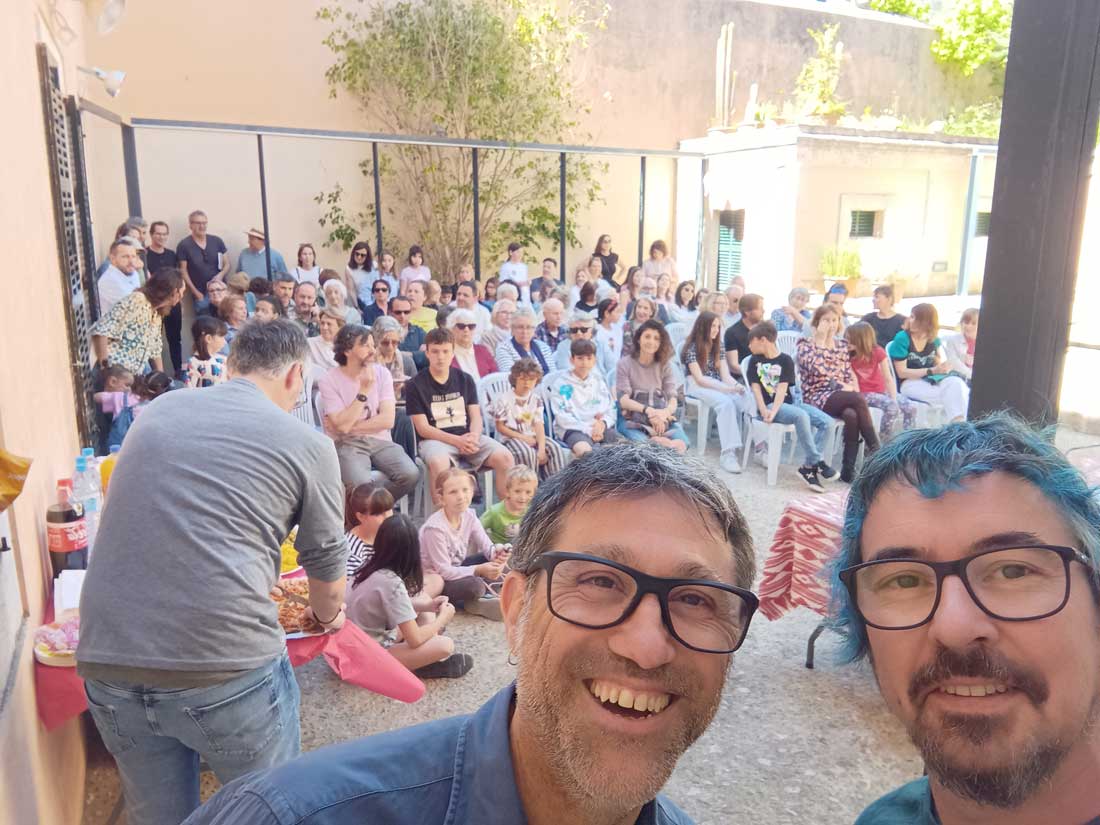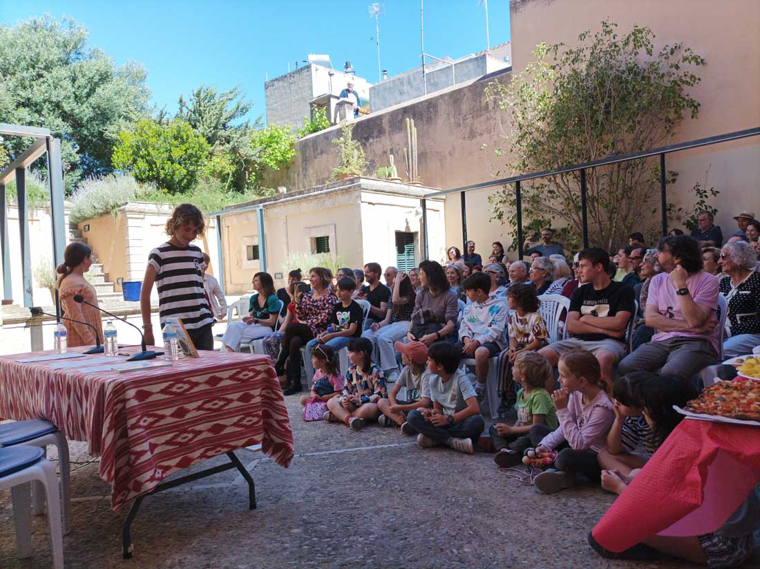 Però és que la cosa no va acabar aquí. Diumenge presentàrem el llibre a Campanet, poble natal de son pare, en Guillem Martorell Mir (escriptor i il·lustrador, i professor també) i l’èxit va ser total. Al pati de Cas Metge Dolç, desenes de persones ompliren de bon rotllo i alegria una presentació divertida, original, singular, meravellosa!
