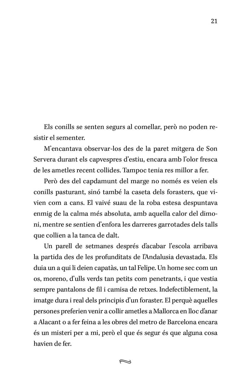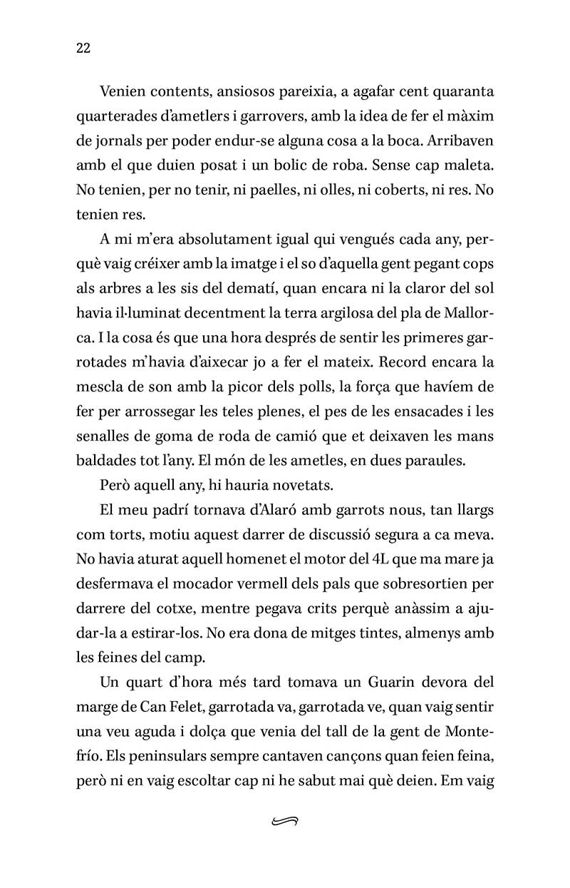 És una novel·la trepidant i alhora nostàlgica, amb un viatge iniciàtic, misteri i llegenda i amb tots els ingredients per fer endinsar les lectores i els lectors en un univers, gairebé desaparegut, però que fins fa poc era una forma de vida per a milers de famílies mallorquines. I encara ara.